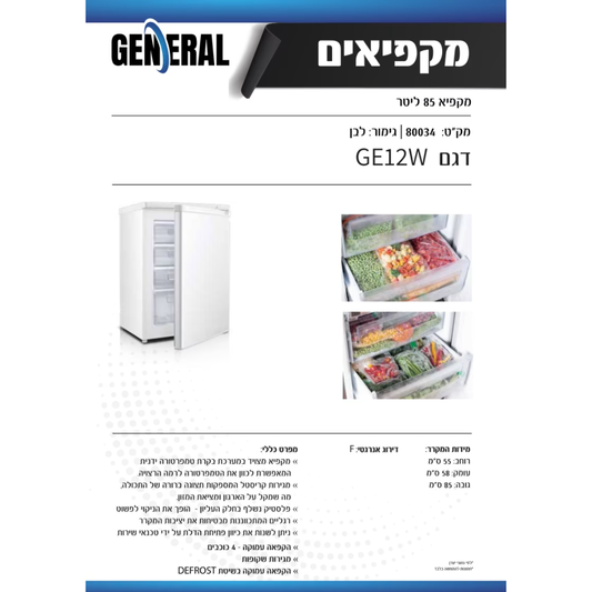 {"type":"root","children":[{"type":"list","listType":"unordered","children":[{"type":"list-item","children":[{"type":"text","value":"בעל 4 מגירות מרווחות ואטומות."}]},{"type":"list-item","children":[{"type":"text","value":"תא הקפאה מהירה."}]},{"type":"list-item","children":[{"type":"text","value":"שיטת הקפאה: DE-FROST."}]},{"type":"list-item","children":[{"type":"text","value":"דירוג אנרגיה F"}]}]}]}