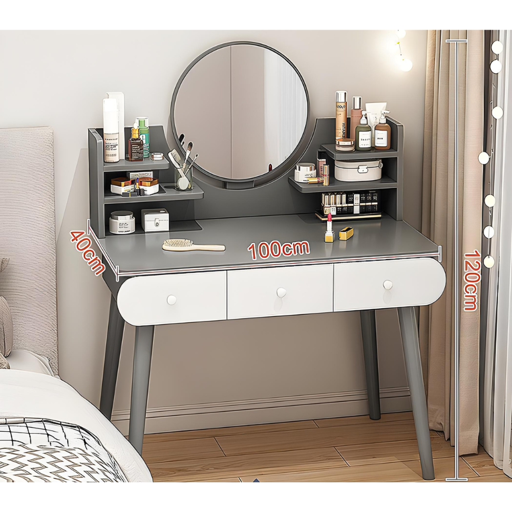 סט שידת איפור עם מראה רוחב 100 ס"מ דגם MSH-10-30 צבע אפור והדום בד יוקרתי דגם RSM-3014 שמנת מבית ROSSO ITALY - יבואן רשמי