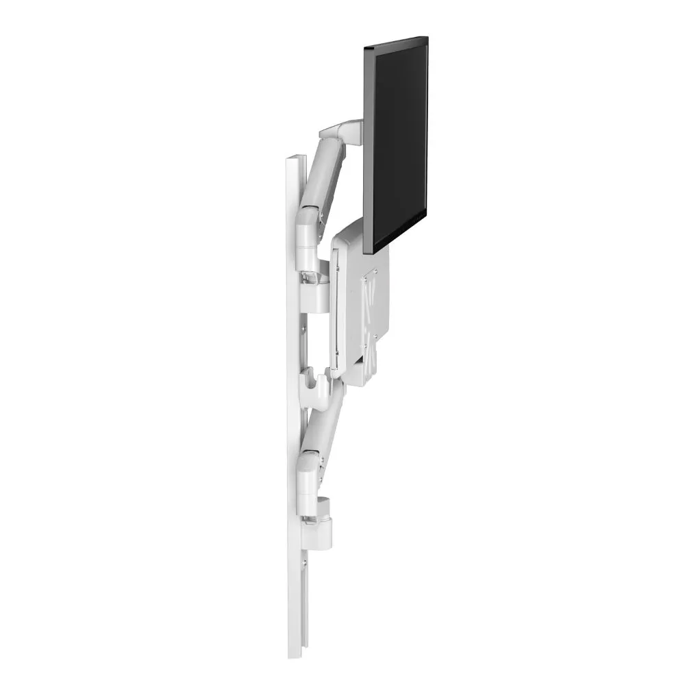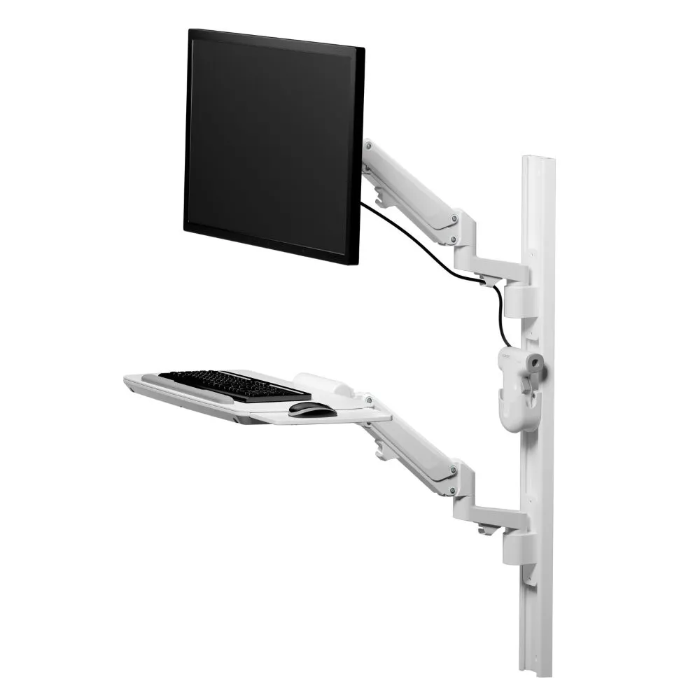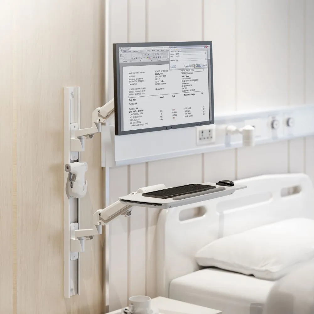 עמדת עבודה רפואית כפולה, עם 2 זרועות, זרוע אחת למסך מחשב בגודל עד 43″, זרוע שנייה למקלדת ועכבר עם פד עכבר נשלף.